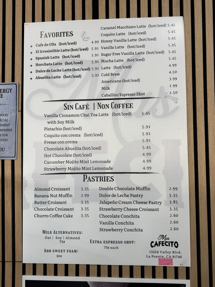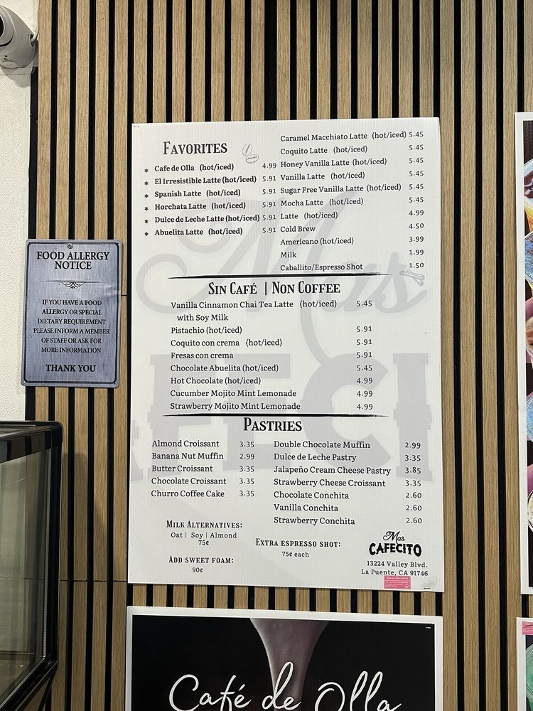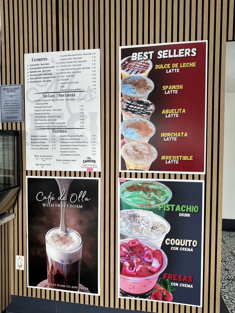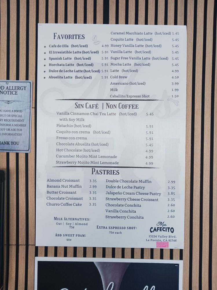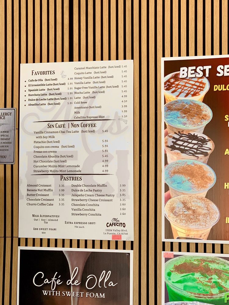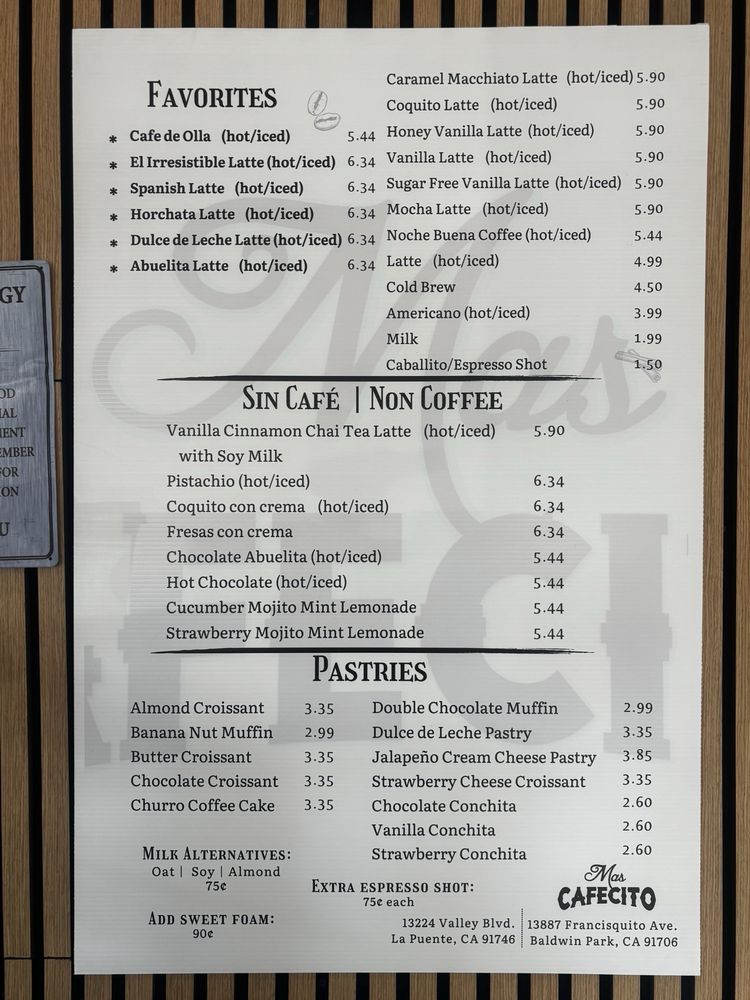 Introducing Más Cafecito Coffee: Located in Baldwin Park, California, Más Cafecito Coffee brings a vibrant atmosphere where coffee lovers can indulge in a unique array of beverages and pastries. The menu features delightful options, such as the Cafe De Olla ($4.99), El Irresistible Latte ($5.91), and various enticing lattes, including the delightful Dulce De Leche Latte ($5.91). For those seeking something refreshing, the Cucumber Mojito Mint Lemonade ($4.99) is a must-try.